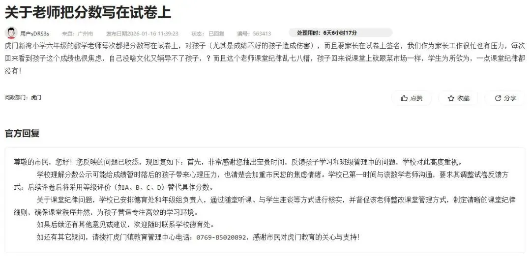 近日,有东莞的小学生家长在阳光问政平台上,投诉老师把分数写在试卷上。这位家长反映,他家孩子在虎门某小学就读六年级,孩子的数学老师每次都把分数写在试卷上,还要家长在试卷上签名。他(她)表示,老师这样做对孩子(尤其是成绩不好的孩子)造成了伤害,也给他们作为家长的带来压力。针对该留言,虎门镇教育管理中心公开做出了回复:学校理解分数公示可能给成绩暂时落后的孩子带来心理压力,也清楚会加重市民您的焦虑情绪。学校已第一时间与该数学老师沟通,要求其调整试卷反馈方式:后续评卷后将采用等级评价(如A、B、C、D)替代具体分数。