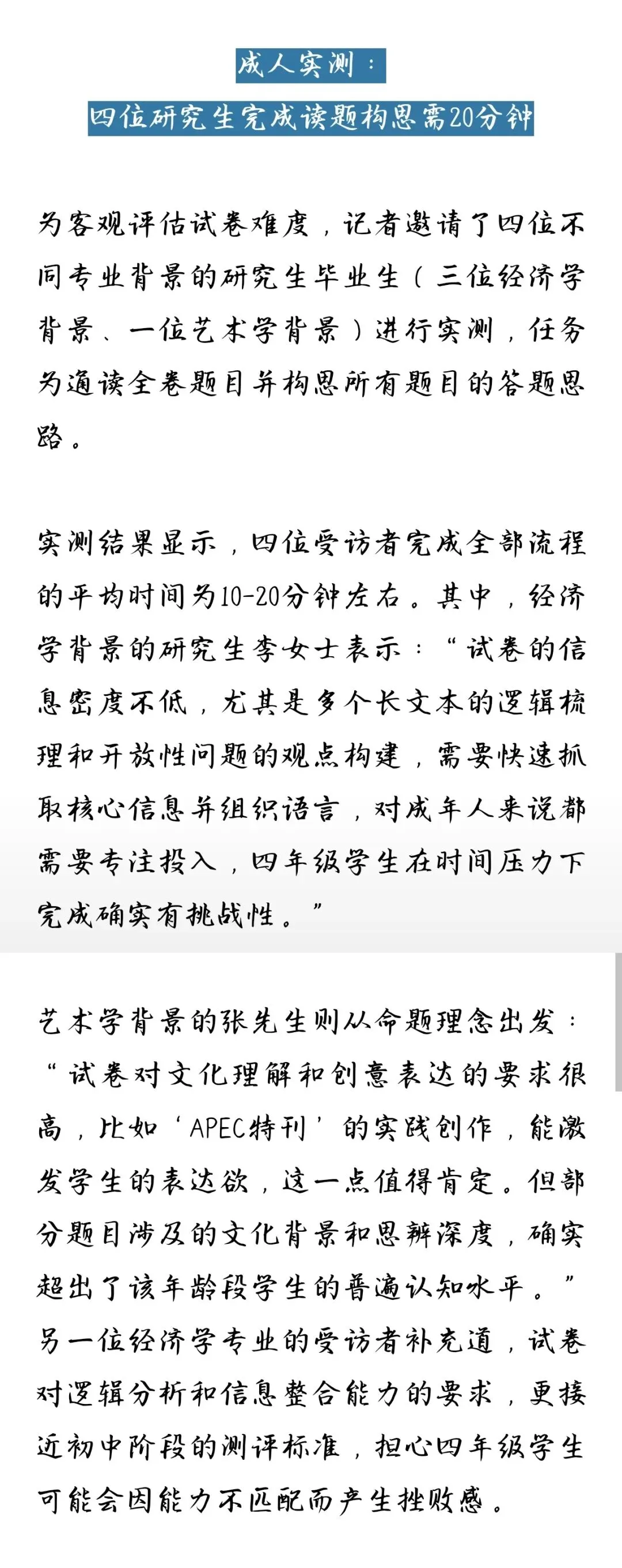 有四位不同专业背景的研究生毕业生进行实测,任务为通读全卷题目并构思所有题目的答题思路,平均时间为10-20分钟。