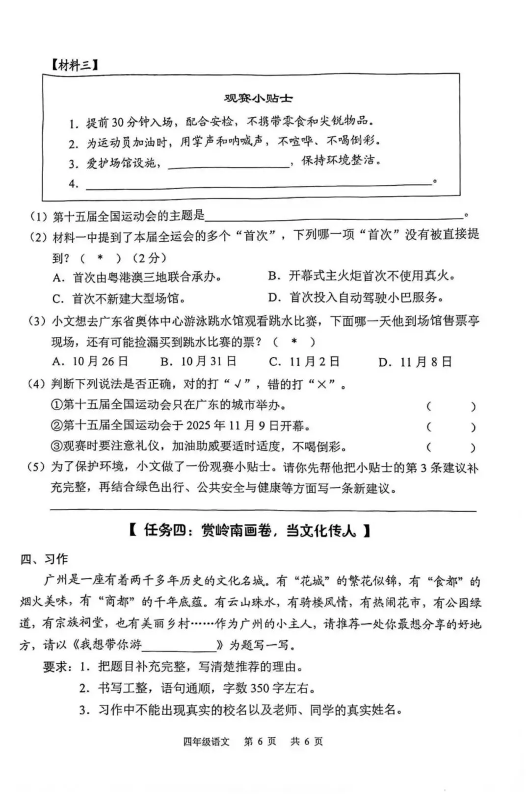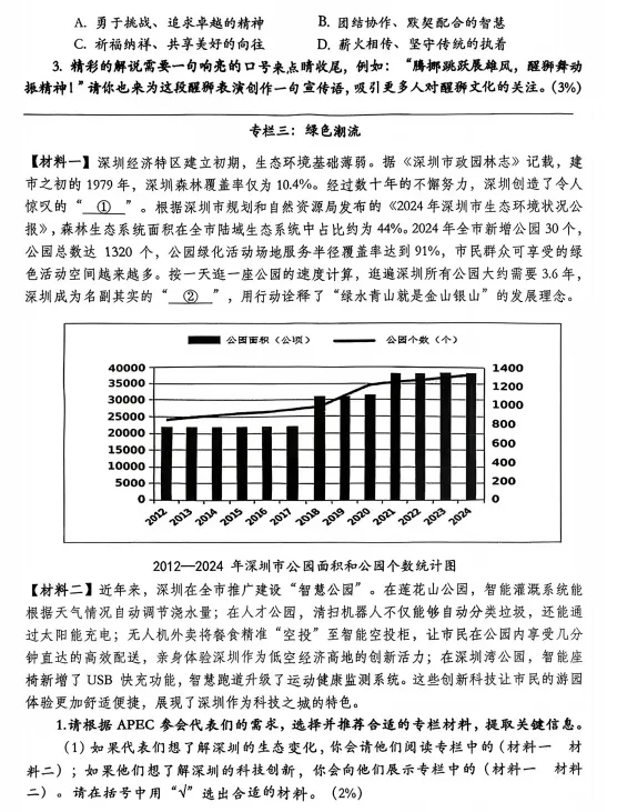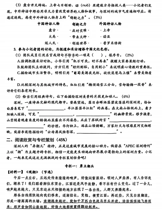 仅从文字编排和篇幅上来看,就远不如深圳卷,且考查范围基本上是课本大纲内的,阅读考了2025年举办的全运会,作文写自己熟悉的大广州,可写的范围也很宽,难度不算大。