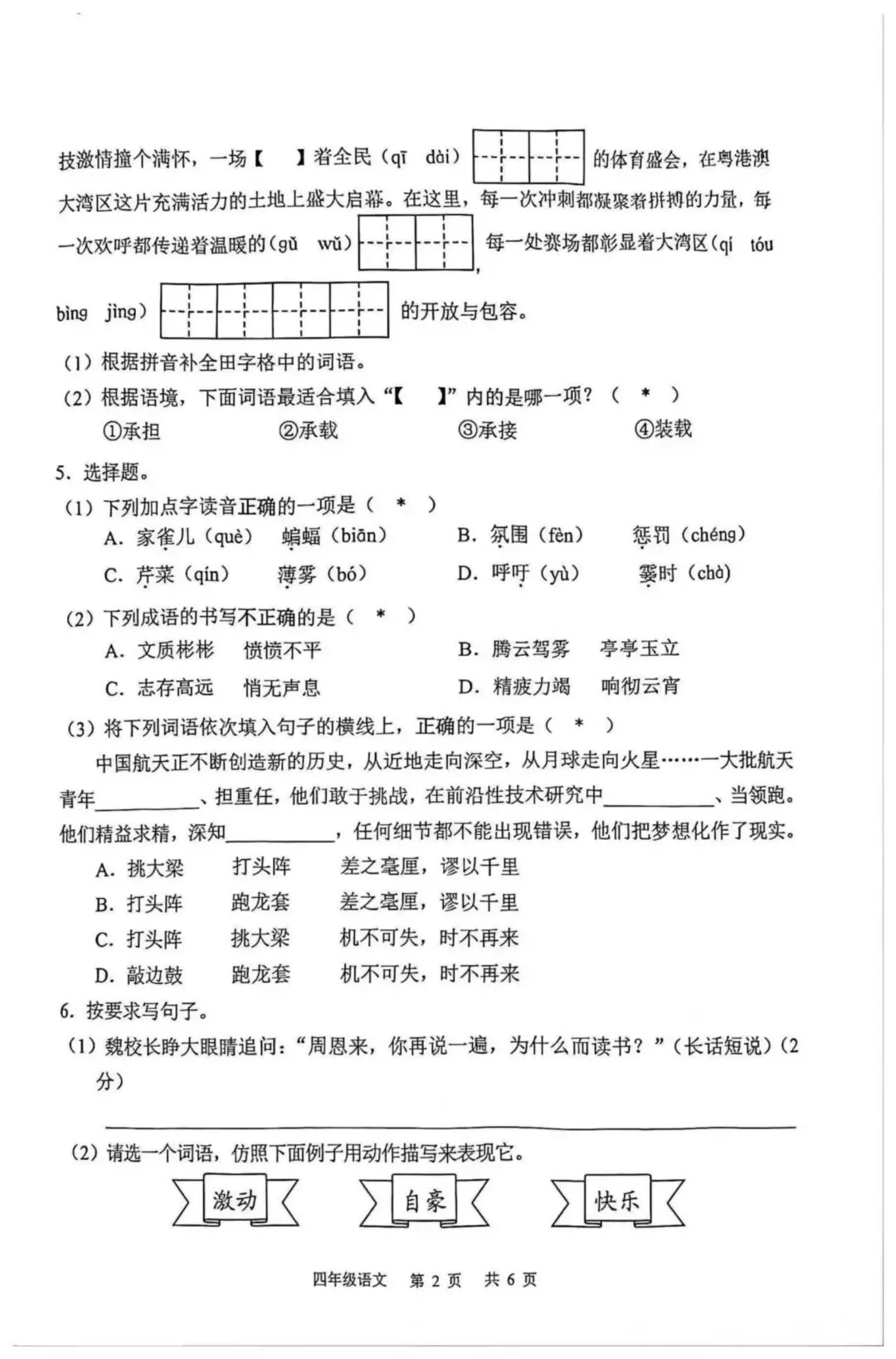 2026年深圳市南山区四年级上册语文期末试卷(第2页/共6页)