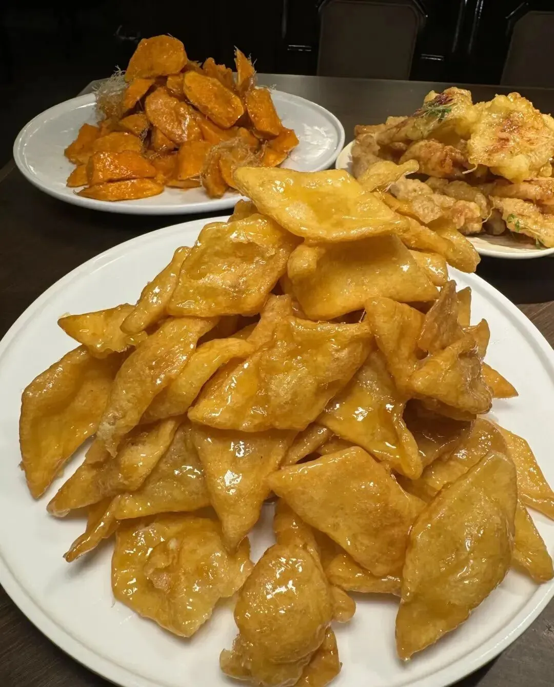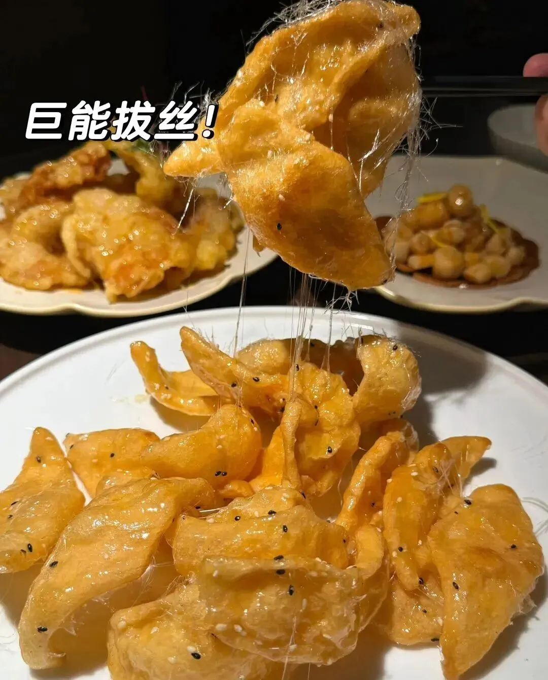 最后上了个拔丝地瓜收尾 , 拉丝拉得老长了 , 甜而不腻 , 小时候的味道一下子就回来了。