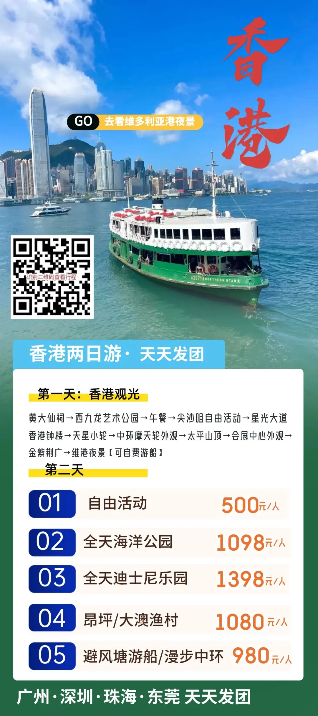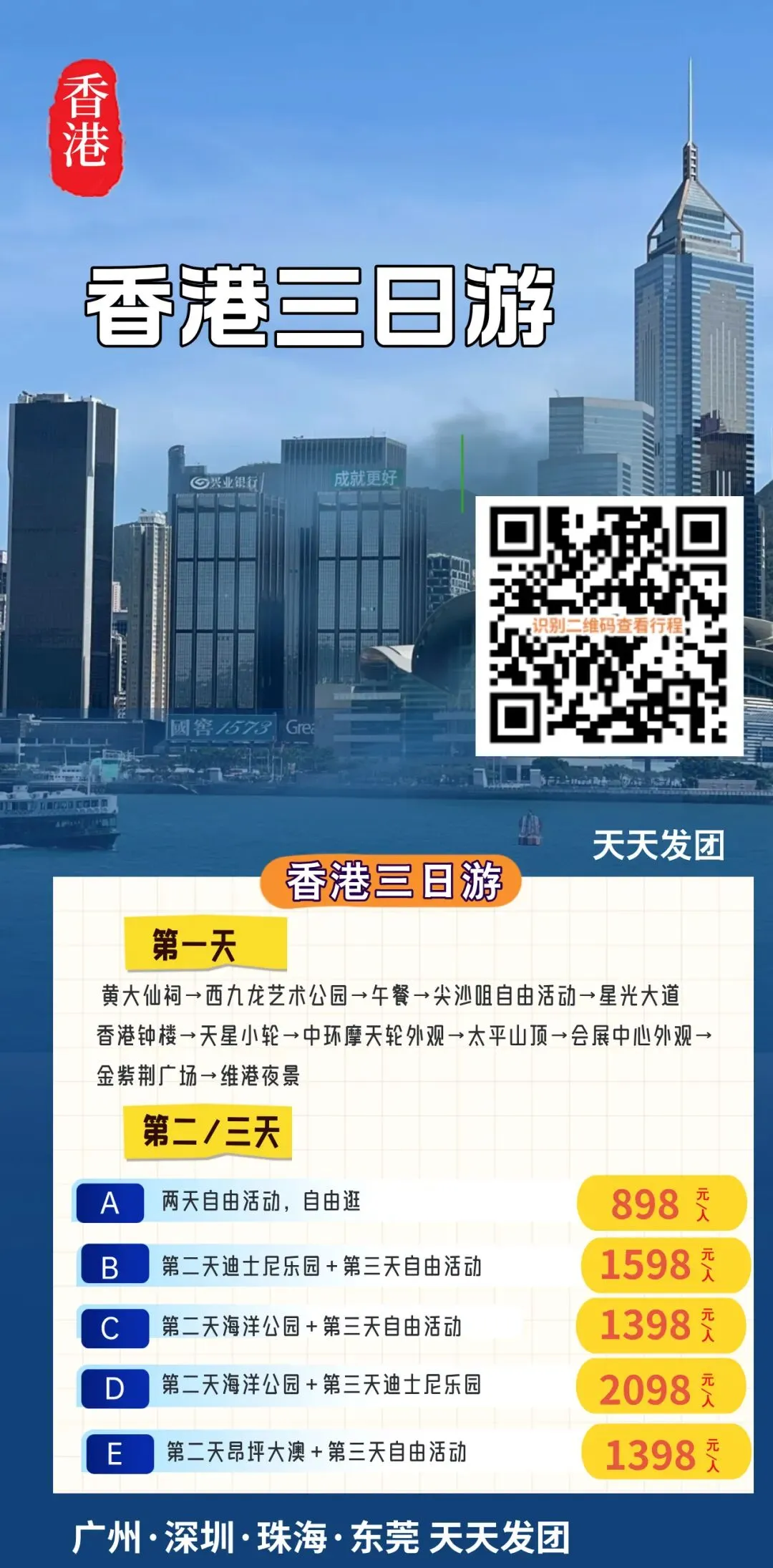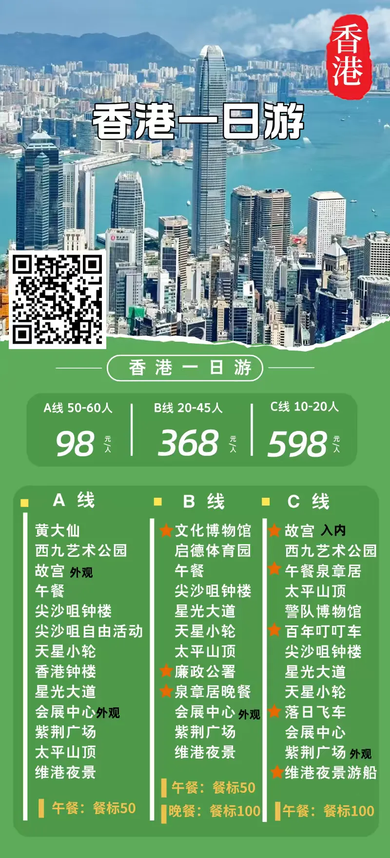 第一天 | 深圳莲塘口岸-出发地~黄大仙祠~西九龙艺术公园~午餐~星光大道~尖沙咀·钟楼~(赠送)天星小轮~中环摩天轮(外观)~太平山顶~会展中心(外观)~金紫荆广场~自理晚餐~维港夜景(可自费游船)~酒店 | 无 | 含 | 无 | 香港 |
