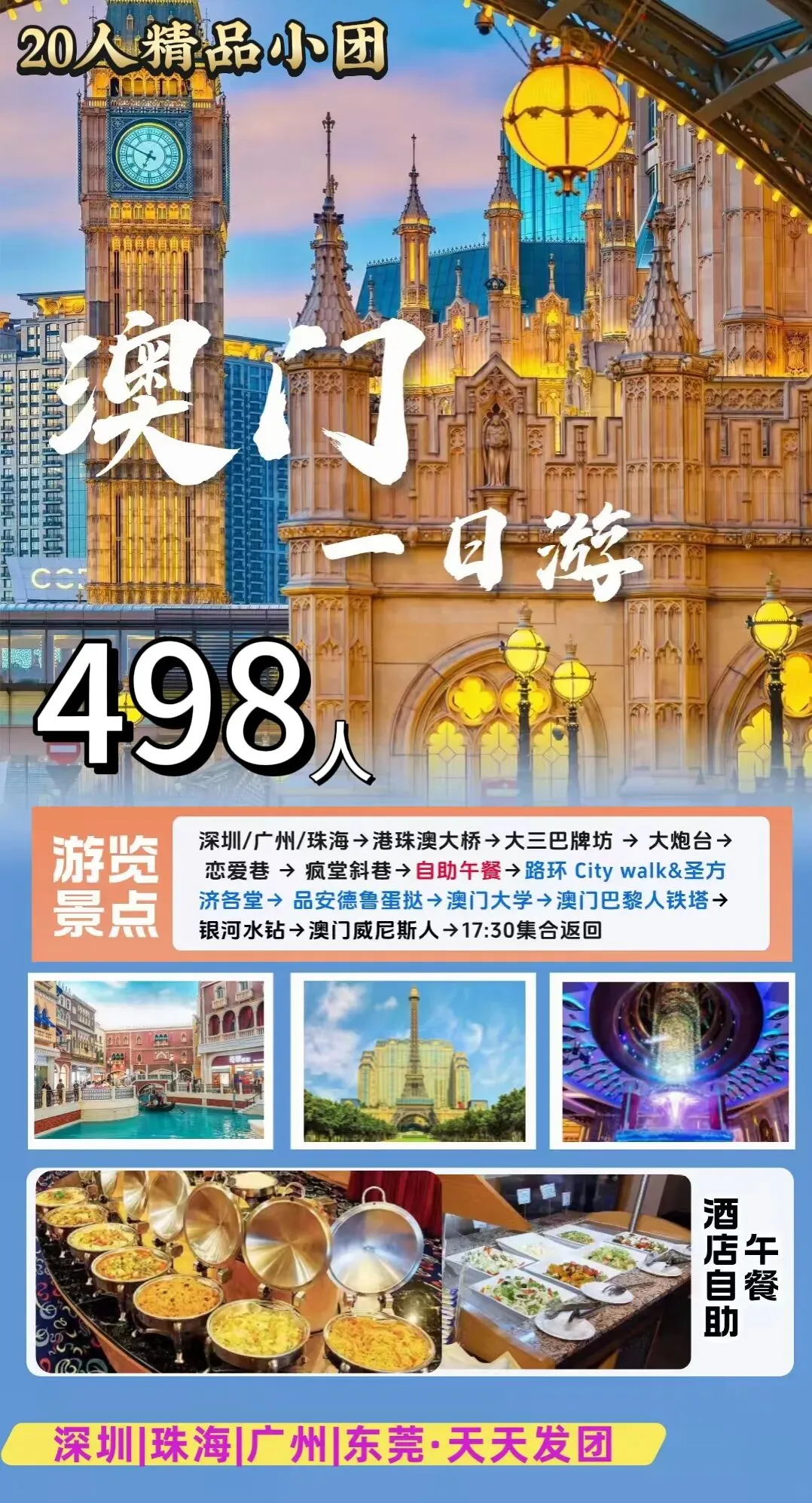 第二天 | 酒店~港珠澳大桥~大三巴~澳门海事博物馆~美高梅天幕花园~新老葡京地标打卡~午餐~伦敦人(外观~威尼斯人度假区~澳门银河运财水钻表演~送返珠海公路口岸,结束旅程! | 无 | 含 | 无 | 无 |