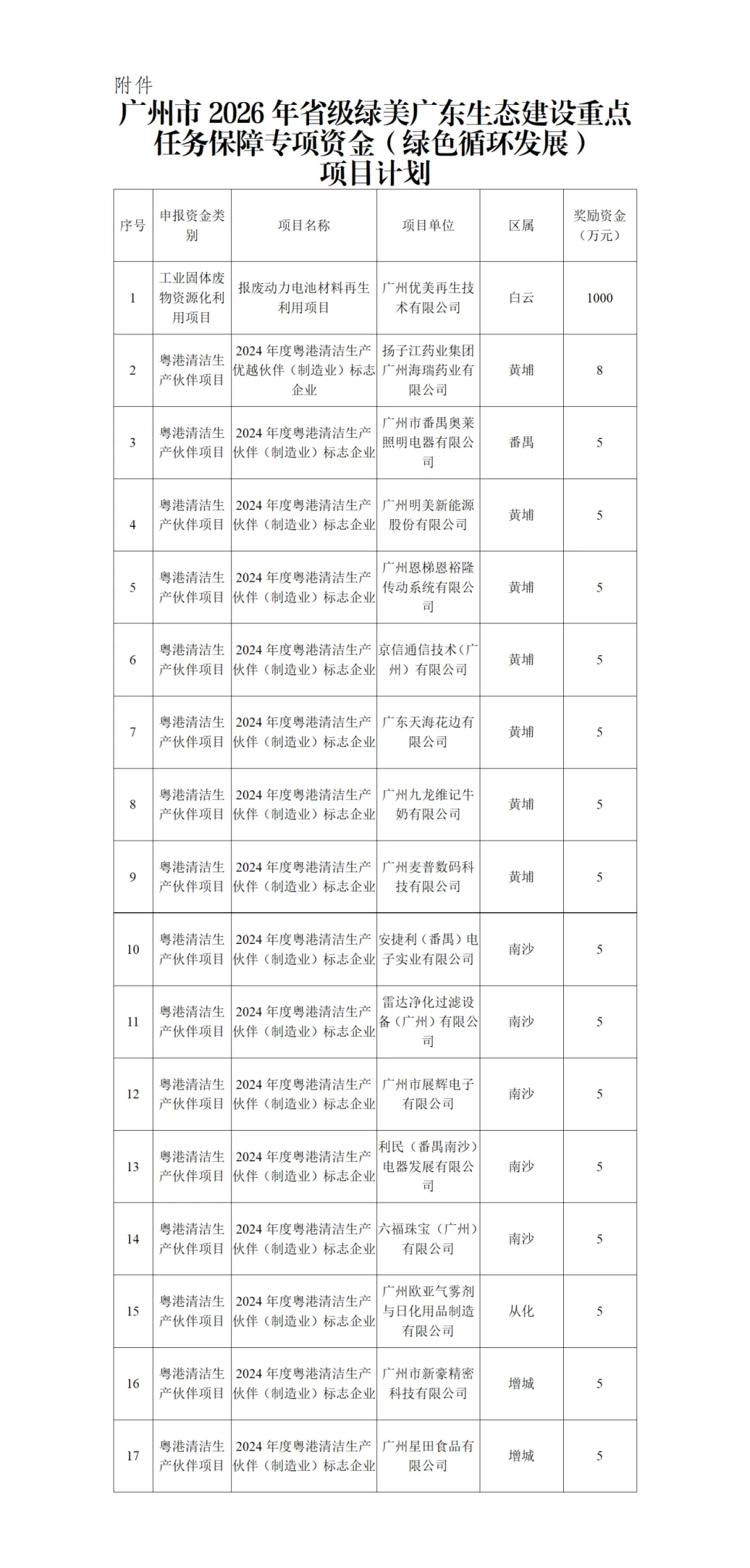 根据《广州市工业和信息化局做好2026年绿美广东生态建设重点任务保障专项资金(绿色循环发展)项目入库工作的通知》《广东省工业和信息化厅关于下达2026年省级绿美广东生态建设重点任务保障专项资金(绿色循环发展)项目计划的通知》的相关要求,经企业申报、区工信部门初审、专家评审和现场检查、市工信局审核等程序,现提出我市2026年省级绿美广东生态建设重点任务保障专项资金(绿色循环发展)项目计划。为体现公开、公平、公正原则,现对入选项目予以公示(见附件)。