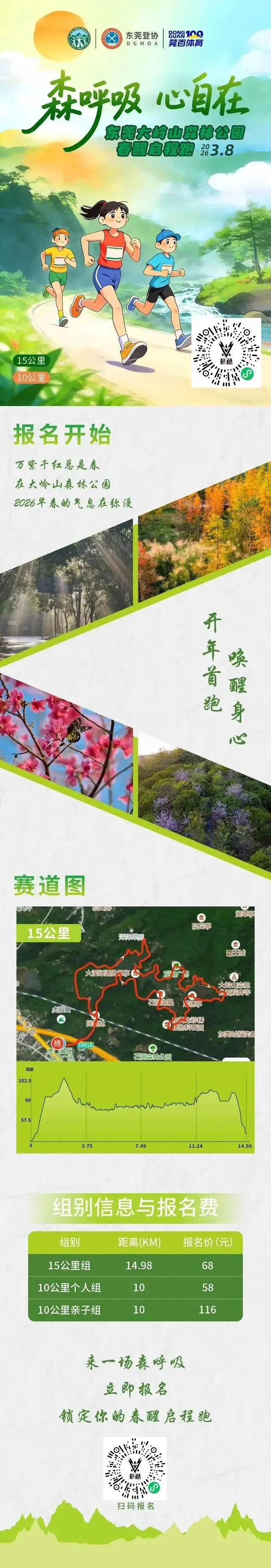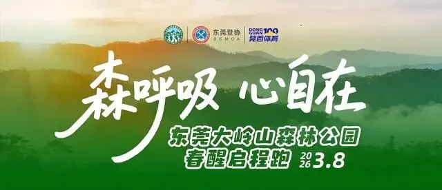 “森呼吸·心自在”2026东莞大岭山森林公园春醒启程跑定于3月8日(周日)上午7:00在广东省东莞市虎门镇大岭山森林公园虎门景区入口开跑,设15公里、10公里两个组别;先报先得,额满即止!