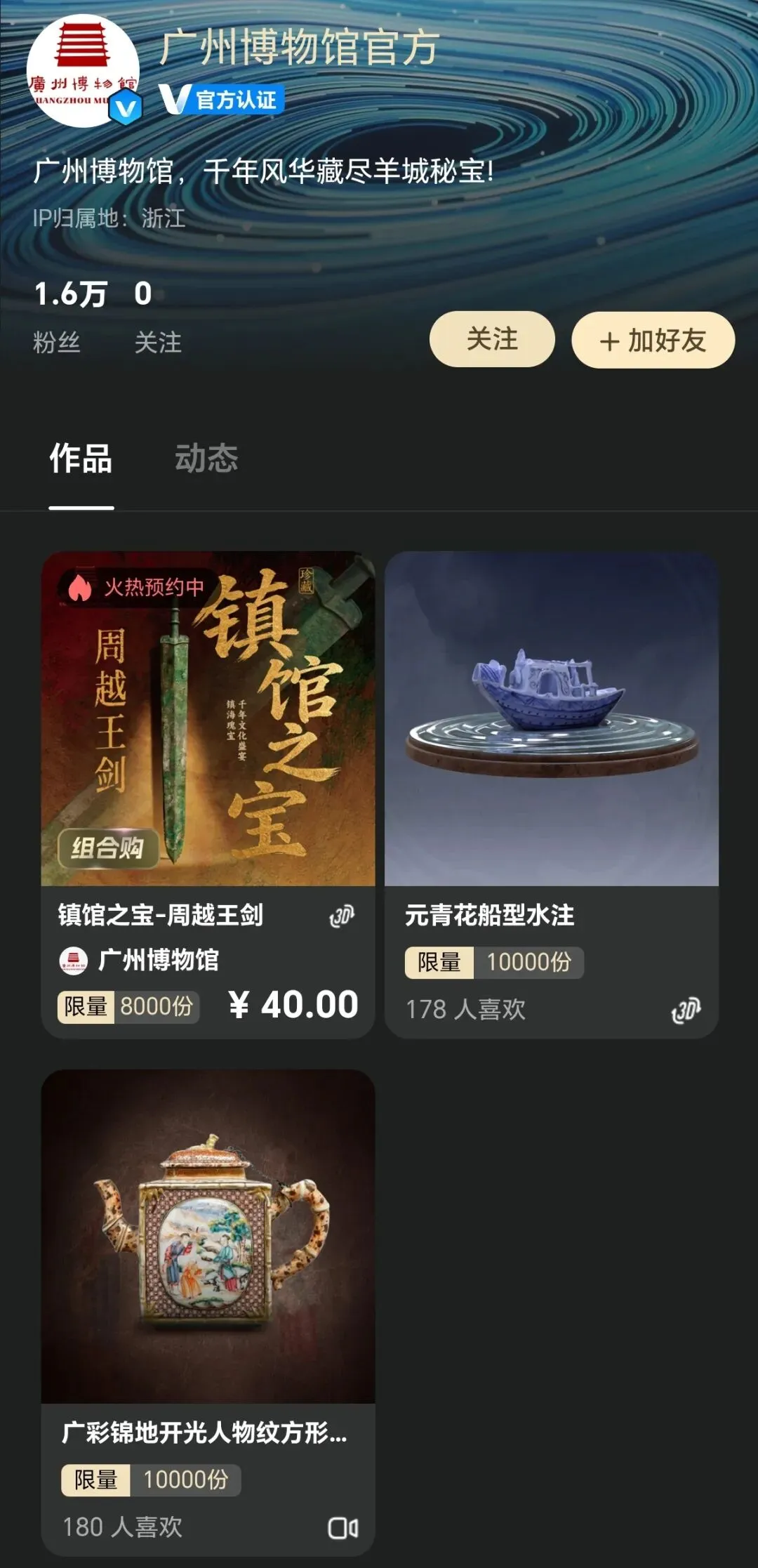 广州博物馆在回归前仅发售了2款数字藏品。一款是3D类型的“元青花船型水注”,一款是视频类型的“广彩锦地开光人物纹方形茶壶”。