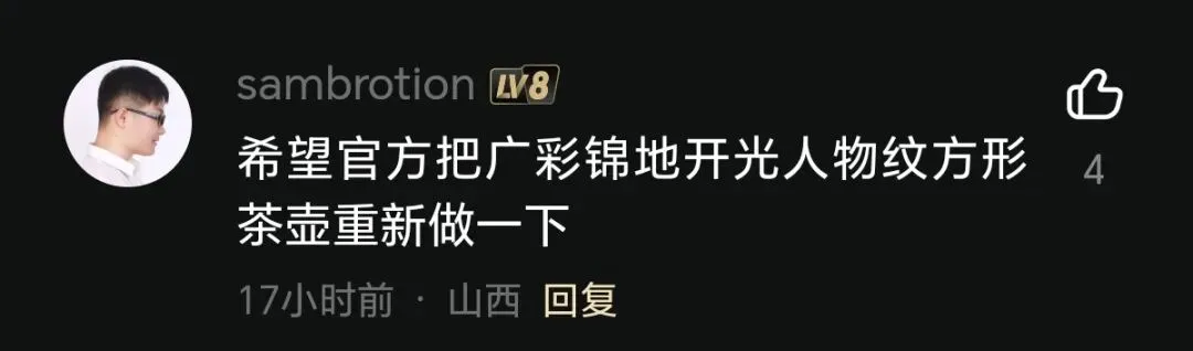 部分藏友对广州博物馆的这次回归是否会升级或空投新的“广彩锦地开光人物纹方形茶壶”也充满各种期待。毕竟其他发行方回归后对一些老藏品进行升级或者空投并非没有先例,如秦始皇帝陵博物院的“二号车”、天津市博物馆的“西周•太保鼎”、姚建萍的“我爱中华”等。但是也不是绝对,有可能期待越大失望越大,平常心对待就好。