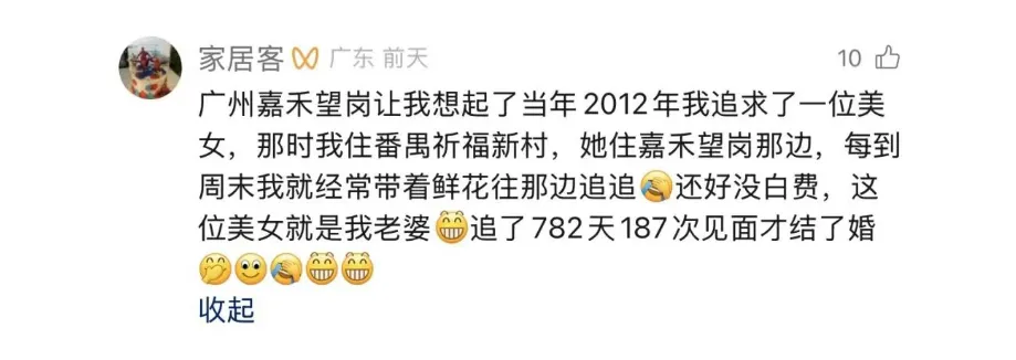 然而,一条温馨的留言为这份伤感添上了暖色:“2012年我住番禺祈福新邨,她在嘉禾望岗,每个周末都揣着鲜花赶几十公里地铁赴约,782天、187次见面,如今她是我老婆。”这束跨越31.8公里地铁线的微光,不仅晕开了番禺的温柔底色,也让嘉禾望岗的离别叙事,多了几分关于坚守与奔赴的安慰。