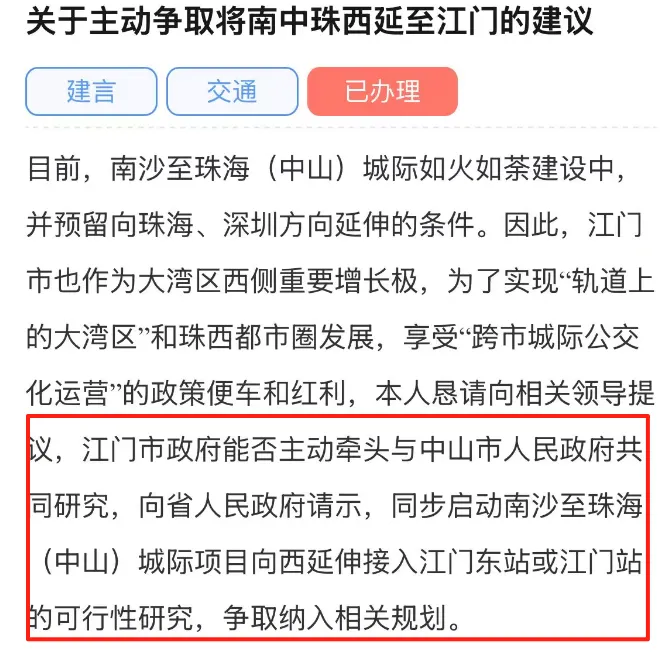 近日,有市民在人民网留言板上提出:关于主动争取将南中珠西延至江门的建议。