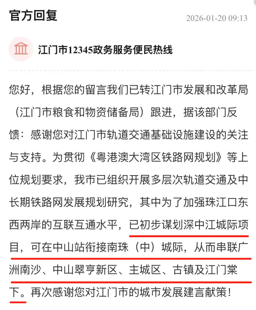 该名市民在建议中提出,希望江门市政府能主动牵头与中山市人民政府共同研究,向省人民政府请示,同步启动南沙至珠海(中山)城际项目向西延伸接入江门东站或江门站的可行性研究,争取纳入相关规划。