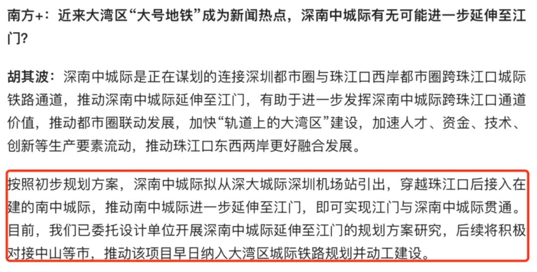 早前,江门市发改局就曾透露,已开展深南中城际延伸至江门方案研究。