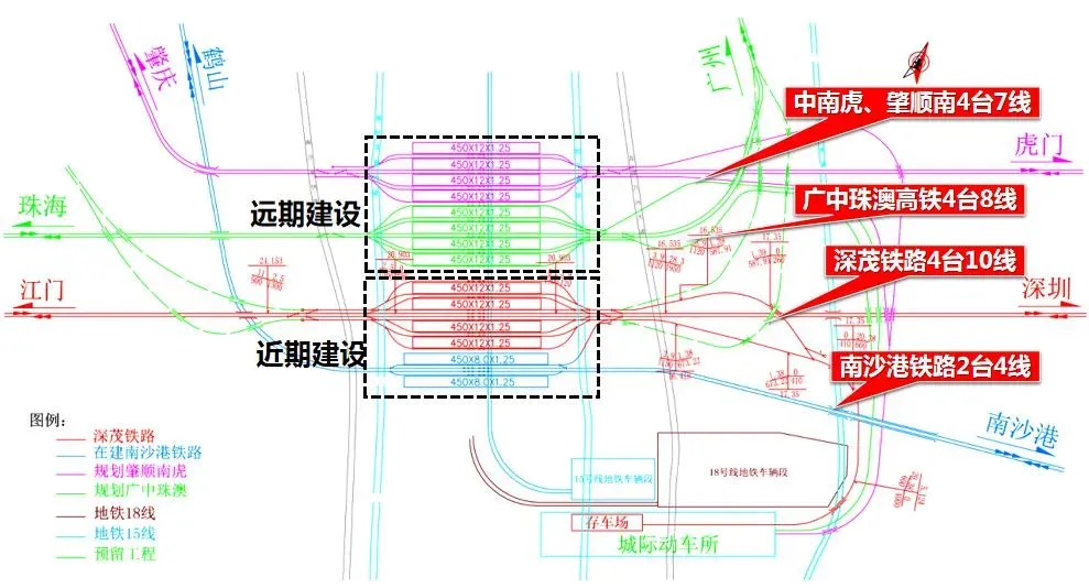 其中,南沙站近期实施南沙港铁路2台4线,深江铁路4台10线,站场规模6台14线(含正线4条,其中南沙港铁路和深江铁路各2条)。