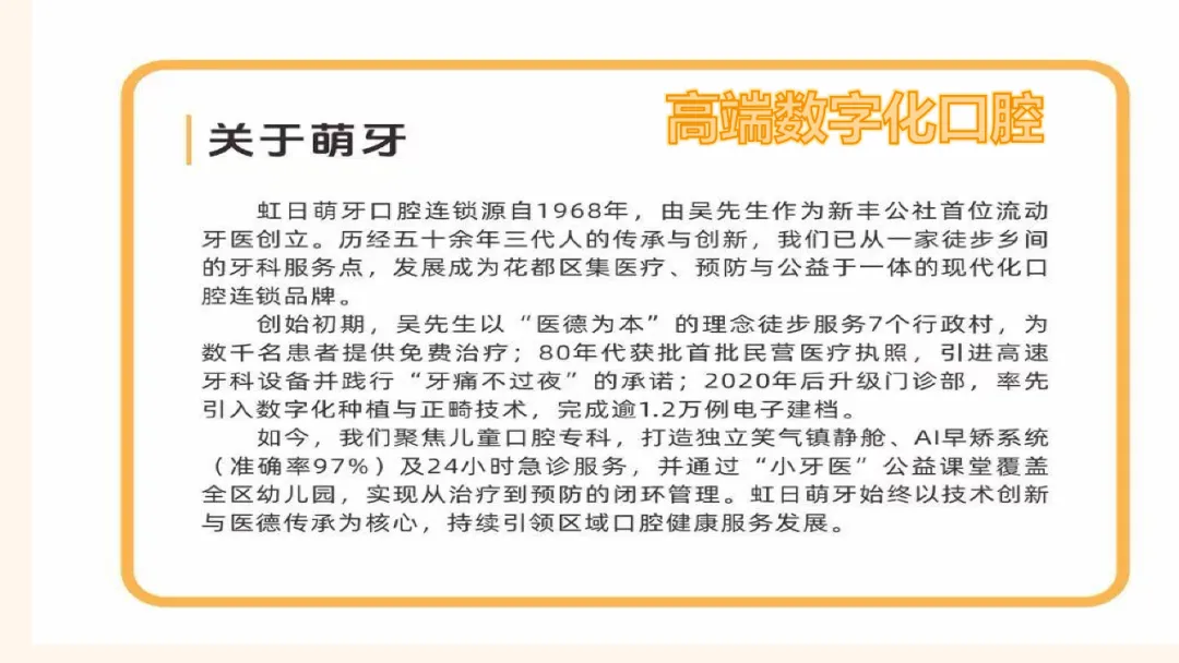创始初期,吴先生以“医德为本”的理念徒步服务7个行政村,为数千名患者提供免费治疗;80年代获批首批民营医疗执照,引进高速牙科设备并践行“牙痛不过夜”的承诺;2020年后升级门诊部,率先引入数字化种植与正畸技术,完成逾1.2万例电子建档。如今,我们聚焦儿童口腔专科,打造独立笑气镇静舱、AI早矫系统(准确率97%)及24小时急诊服务,并通过“小牙医”公益课堂覆盖全区幼儿园,实现从治疗到预防的闭环管理。虹日萌牙始终以技术创新与医德传承为核心,持续引领区域口腔健康服务发展。