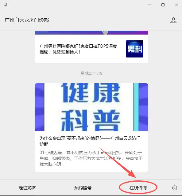 打开微信搜索广州白云龙济门诊部,(点击“广州白云龙济门诊部”小程序。)