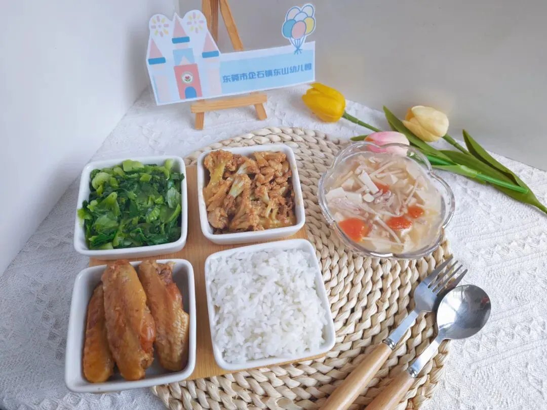 香米饭、可乐鸡翅、椰菜花炒肉、清炒上海青、三鲜菌菇汤