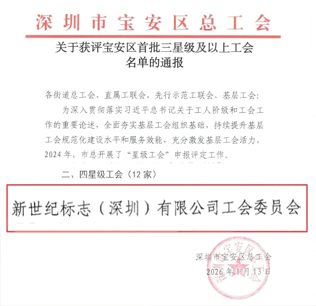 展望未来,新世纪标志(深圳)有限公司工会委员会将在“四星级”的新起点上,继续践行服务职工、助力发展的使命担当,为企业与区域发展注入更多温暖与力量。