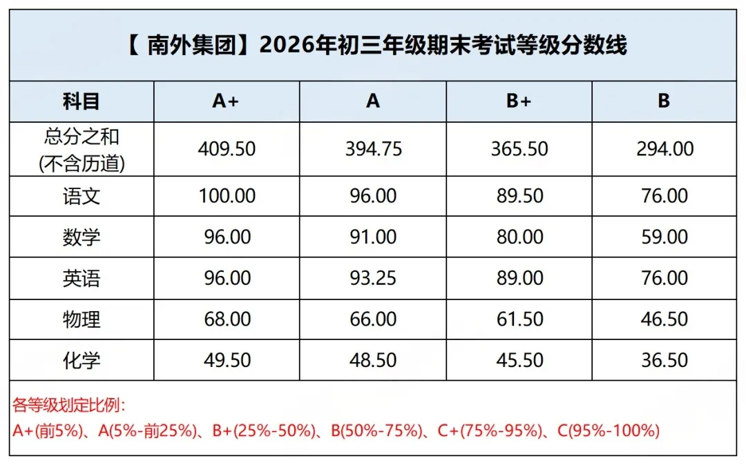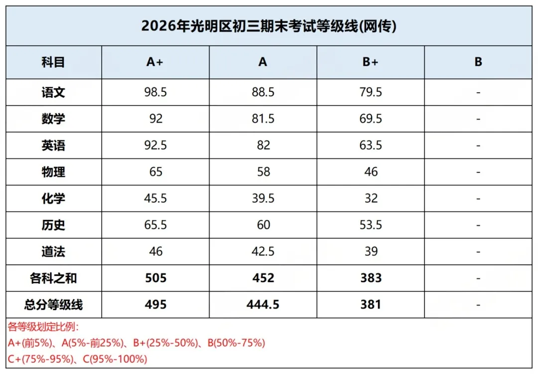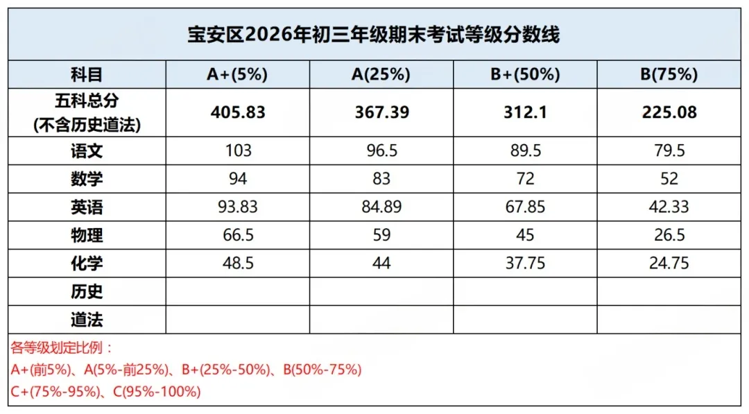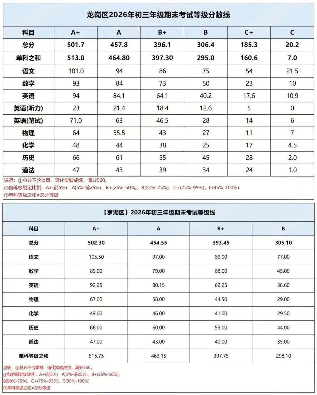 更新!深圳八区/校2025-2026学年初三上期末考试等级线