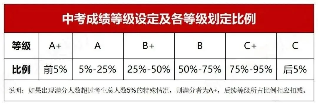 如果出现满分人数超过考生总人数5%的特殊情况,则满分者均为A+,后续等级所占比例相应扣减。