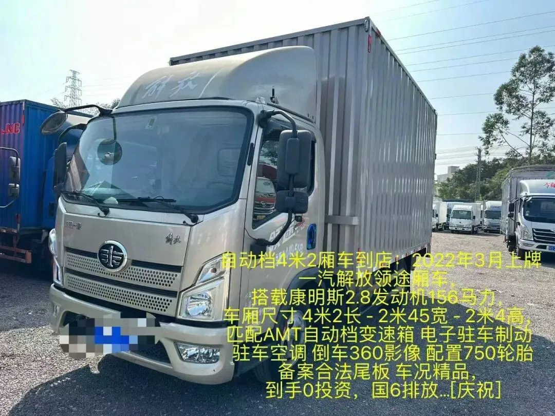 自动档4米2厢车到店:2022年3月上牌 一汽解放领途厢车,搭载康明斯2.8发动机156马力,车厢尺寸 4米2长 - 2米45宽 - 2米4高,匹配AMT自动档变速箱 电子驻车制动 驻车空调 倒车360影像 配置750轮胎,备案合法尾板 车况精品,到手0投资,国6排放…[庆祝]