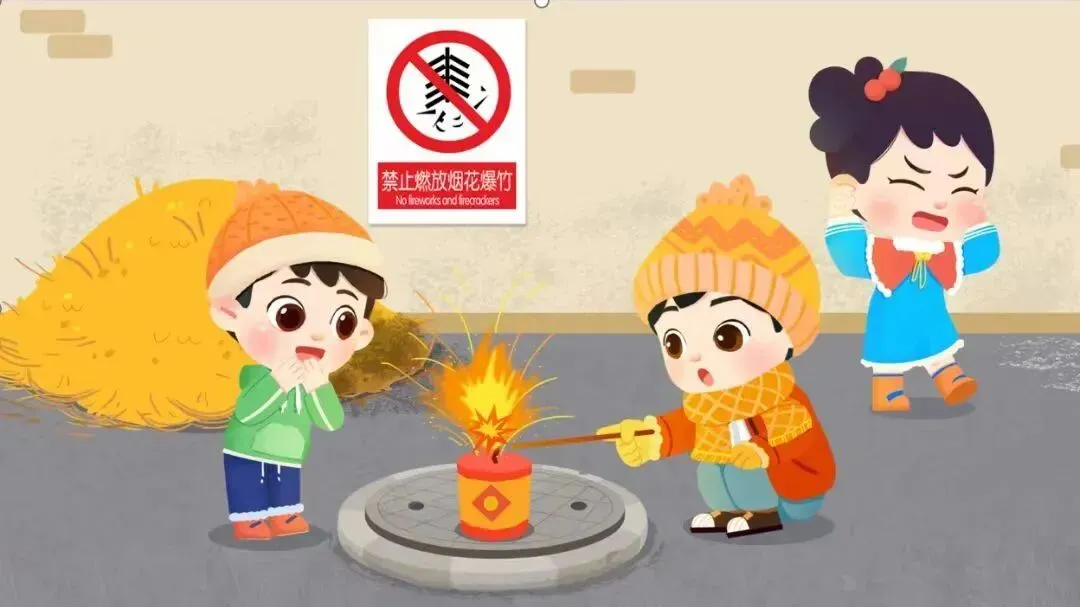 4.告诉孩子不要私自燃放烟花爆竹,勿将鞭炮投放在封闭的容器中和干燥的木柴中。