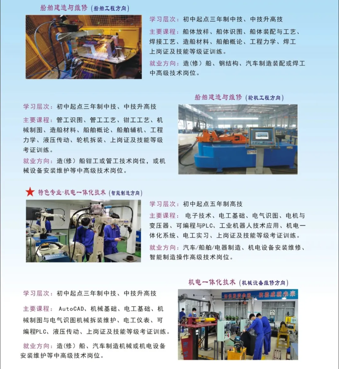广州黄埔造船厂技工学校创办于1961年,至今已有60多年办学历史。学校是中国船舶集团广州船舶工业有限公司主办、广东省人力资源和社会保障厅主管的一所全日制(央企办学)省重点技工学校。学校位于粤港澳大湾区腹地、广州东部的黄埔区长洲街,是举世闻名的黄埔军校蝴蝶岗训练场旧址,毗邻广州大学城、广州塔、琶洲会展中心,距广州地铁七号线长洲站仅100多米,交通非常便利,地理位置十分优越学校以“崇德尚技、精工自强”为校训,坚持“立足中船,服务军工,面向社会,特色办学”,根据企业需要设置专业课程,重点突出军工特有专业特色及产教融合、工学结合模式,优先推荐毕业生到军工央企、国企或合资企业就业,毕业生供不应求。