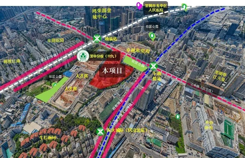商业氛围成熟:项目紧:与深圳中学龙华学校仅一路之隔,属于该校单校划片学区范围内,是片区内稀缺的“新房+名校”组合,对有孩家庭吸引力巨大。交通规划:“双地铁+城际铁路”配置,在建的22号线、规划的27号线站点均在200米内,深大城际民治北站(约800米)预计2026年投用,可快速联通机场。2. 高实用性的产品设计