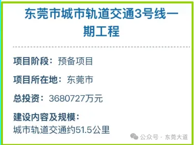 公开资料显示,东莞地铁3号线一期总投资3680727万元(约368亿元),线路长度约51.5公里,项目建设工期6年。