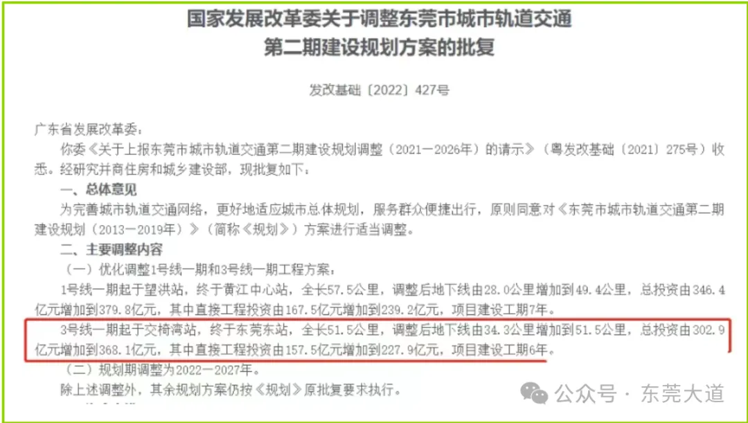 东莞地铁3号线一期项目调整方案于2022年正式获得国家发改委批复,2025年年底官方报告了最新进度,称正在进行可行性研究。
