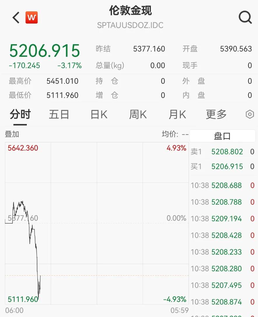 今天(1月30日),现货黄金盘中急速跳水,最低价跌至5111.96美元/盎司,跌幅近5%。
