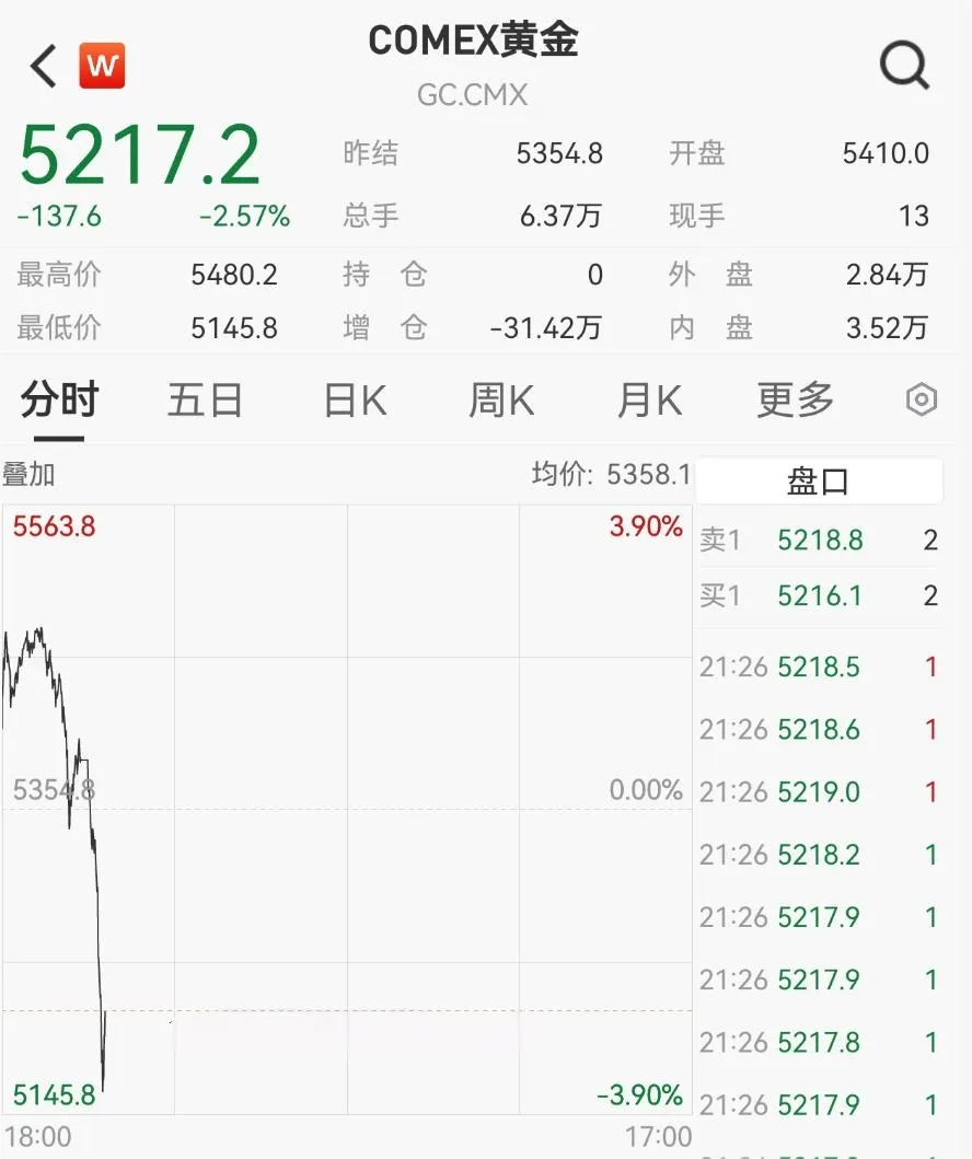 期货市场上,COMEX黄金、白银主力合约同步大跳水。