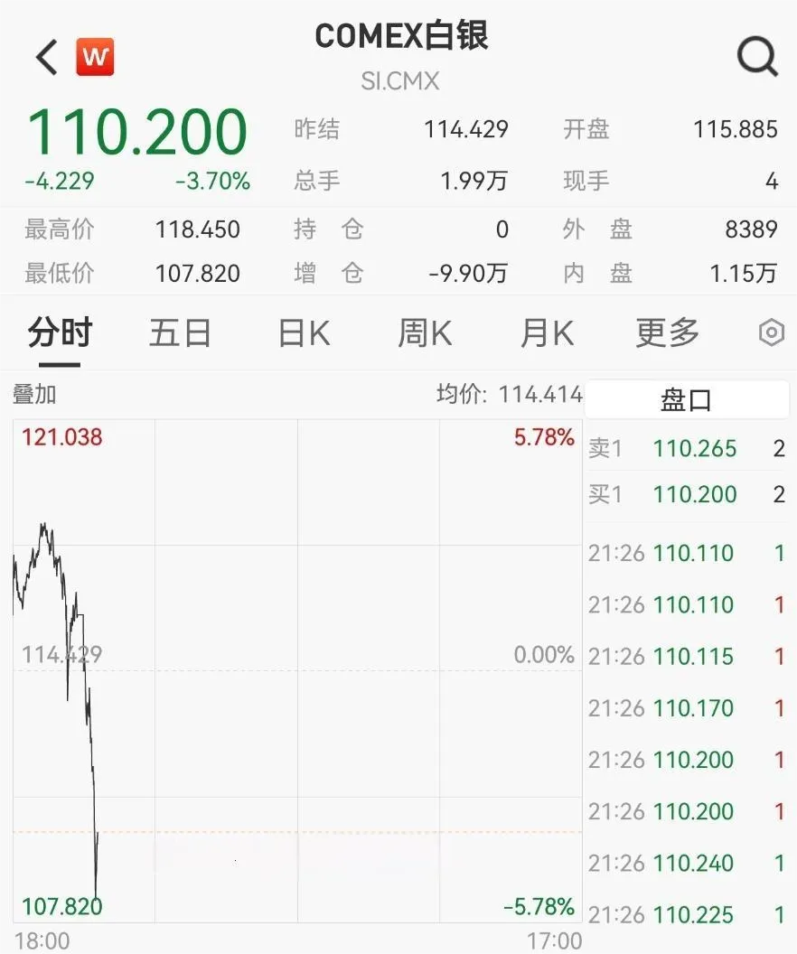 现货白银同步大跌,最低价跌至107.947美元/盎司,跌幅近7%。
