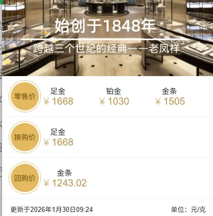 周大福报价1685元/克,老庙黄金报价1690元/克,周生生报价1662元/克,老凤祥报价1668元/克。