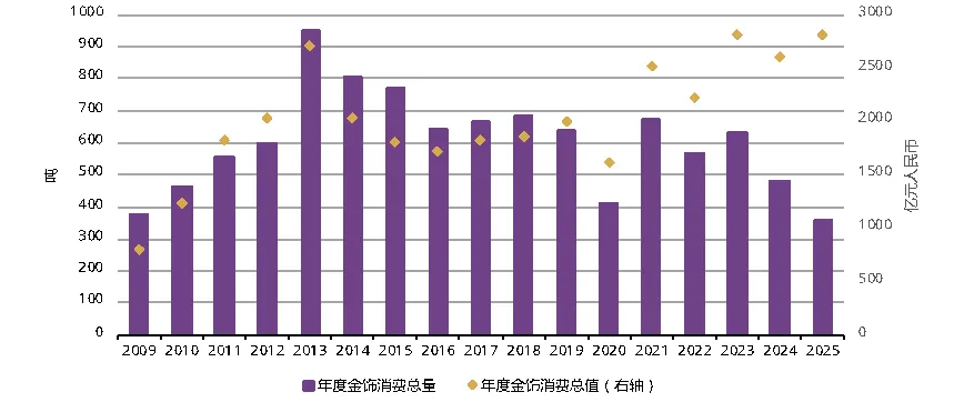 中国金饰需求,金饰消费金额与吨数显著分化。来源:金属聚焦公司,上海黄金交易所,世界黄金协会