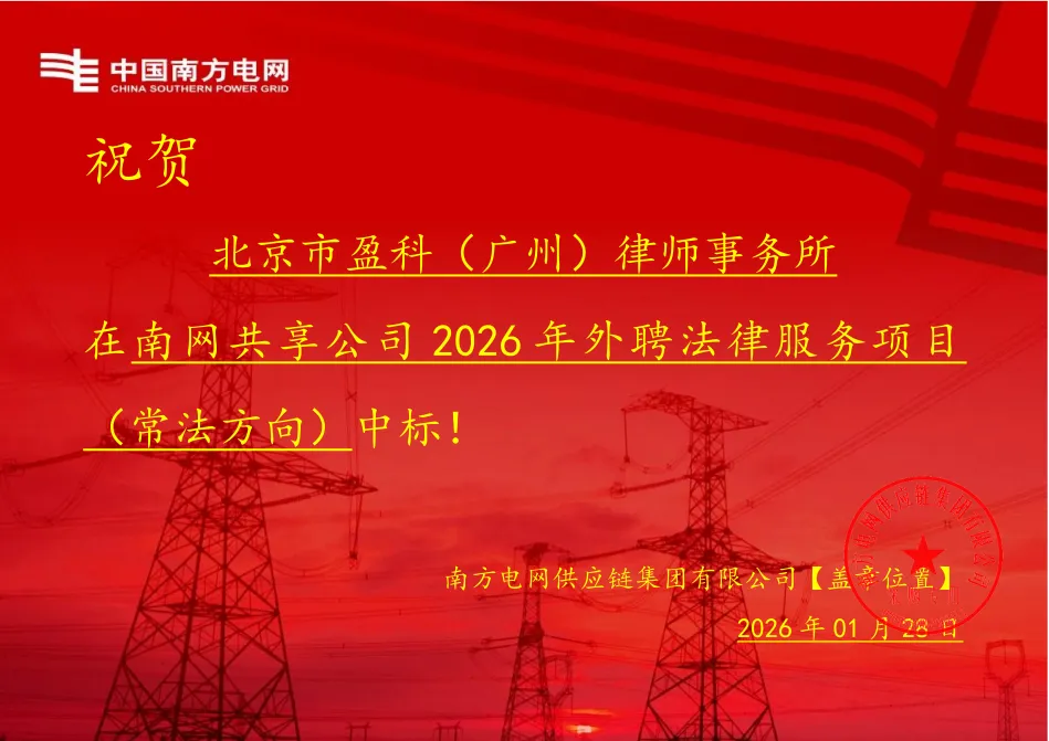 近日,中国南方电网有限责任公司共享运营公司(简称“南网共享公司”)2026年外聘法律服务项目(常法方向)公开选聘结果正式揭晓。北京市盈科(广州)律师事务所(以下简称“盈科广州”)凭借在涉外法律服务领域长期积累的专业优势、成熟的项目化服务体系以及突出的综合服务能力,在激烈竞争中脱颖而出,成功中标“2026年境外业务法律服务项目”。