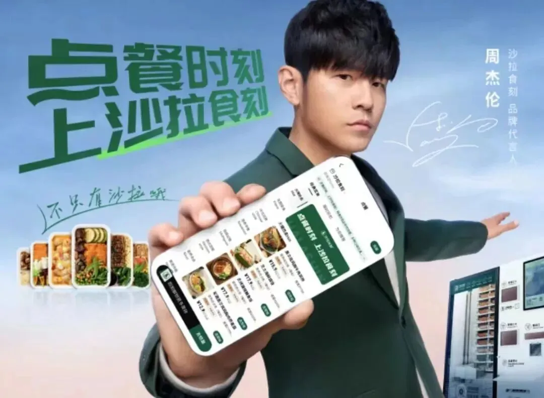 2023年底至2024年,沙拉食刻迎来发展巅峰。先是斩获不惑创投1亿元A轮融资,紧接着官宣周杰伦担任品牌代言人,其宣传视频中“不用麻烦了,上沙拉食刻一点立刻取”的口号一度刷屏。