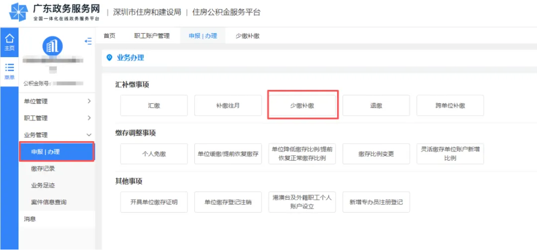 二、选择左边菜单栏--业务管理--申报/办理--少缴补缴。