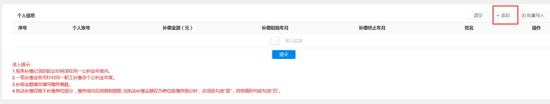 三、点击右边“添加”,填入对应补缴信息,点击“确定”-“提交”,选择“不见面审批线上办理”。(线下办理可选择:申报预约线下办结。)注意:补缴金额为扣费金额,请勿填错成缴费基数。
