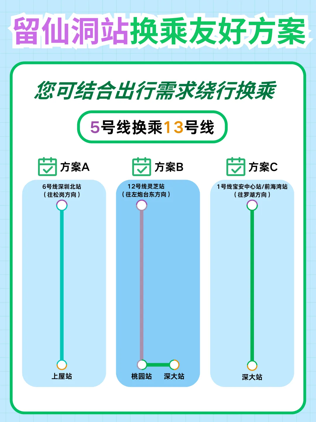 方案B:在灵芝站 → 换乘12号线(往左炮台东方向)→ 桃园站换乘1号线(往罗湖)→ 深大站换乘13号线