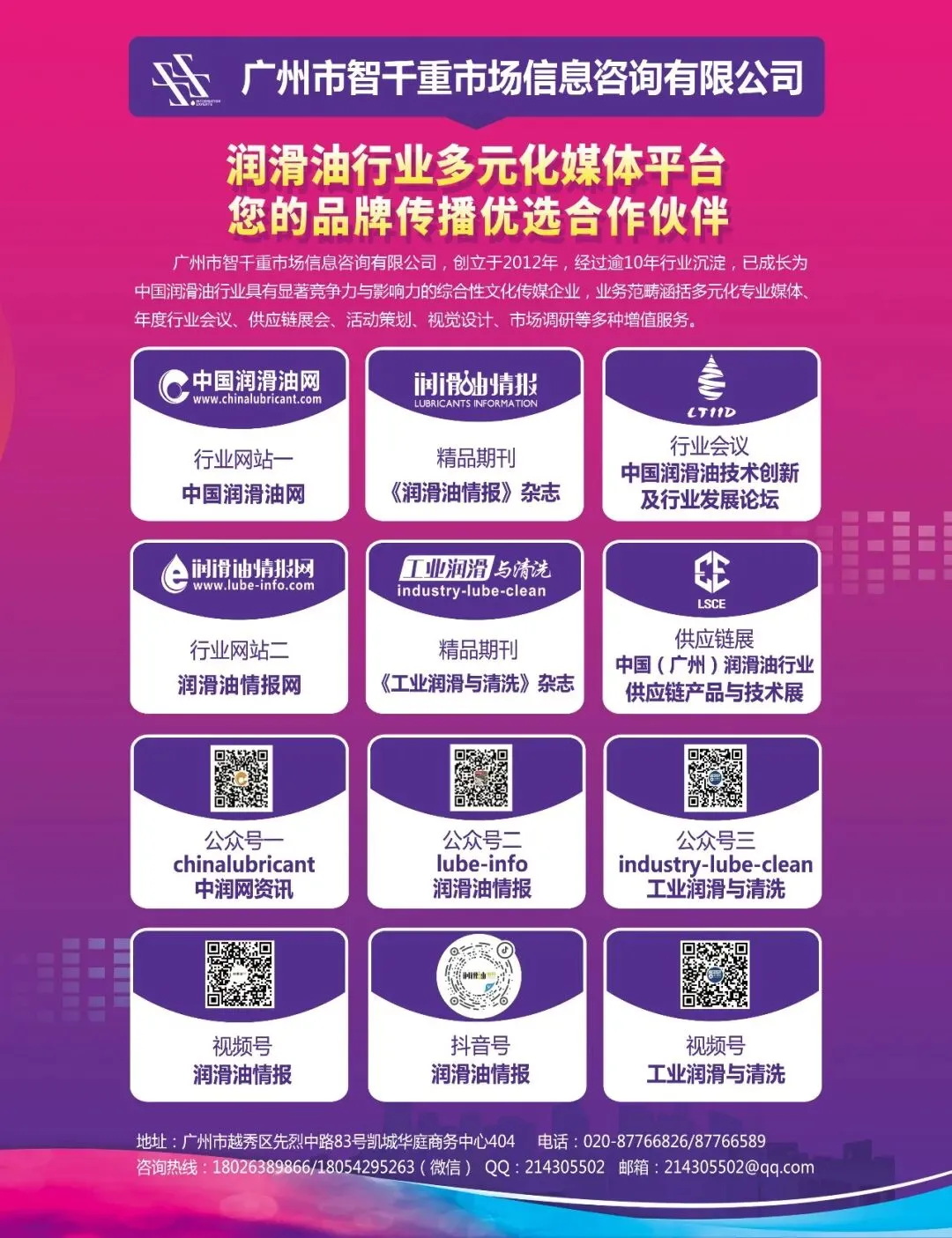 广州市智千重市场信息咨询有限公司,创立于2012年,经过逾10年行业沉淀,已成长为中国润滑油行业具有显著竞争力与影响力的综合性文化传媒企业,业务范畴主要涵括多元化媒体、年度专业会议/展会、活动策划、视觉设计、市场调研等多种增值服务。