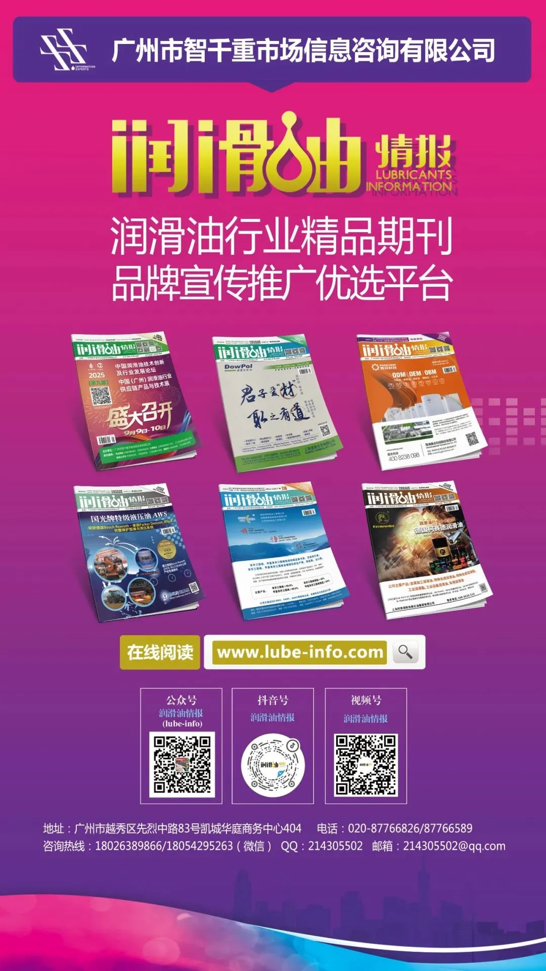 两大主流行业门户网站-中国润滑油网(www.chinalubricant.com)、润滑油情报网(www.lube-info.com);两大精品专业期刊-《润滑油情报》杂志、《工业润滑与清洗》杂志;三大微信公众号-润滑油情报(lube-info)、中润网资讯(chinalubricant)、工业润滑与清洗(industry-lube-clean);视频号-润滑油情报、工业润滑与清洗;抖音号-润滑油情报;其它媒体平台-小红书、B站、快手、微博、今日头条、百家号、一点号、大鱼号、人民号、网易号等,以更多样化的资讯与服务传输模式,精准化受众群体,致力于为行业人士提供更具价值的资讯频道,为广大合作客户提供辐射范围更广、传播效率更高、受众更精准、模式更灵活多样的品牌宣传推广媒体服务,提升客户价值。