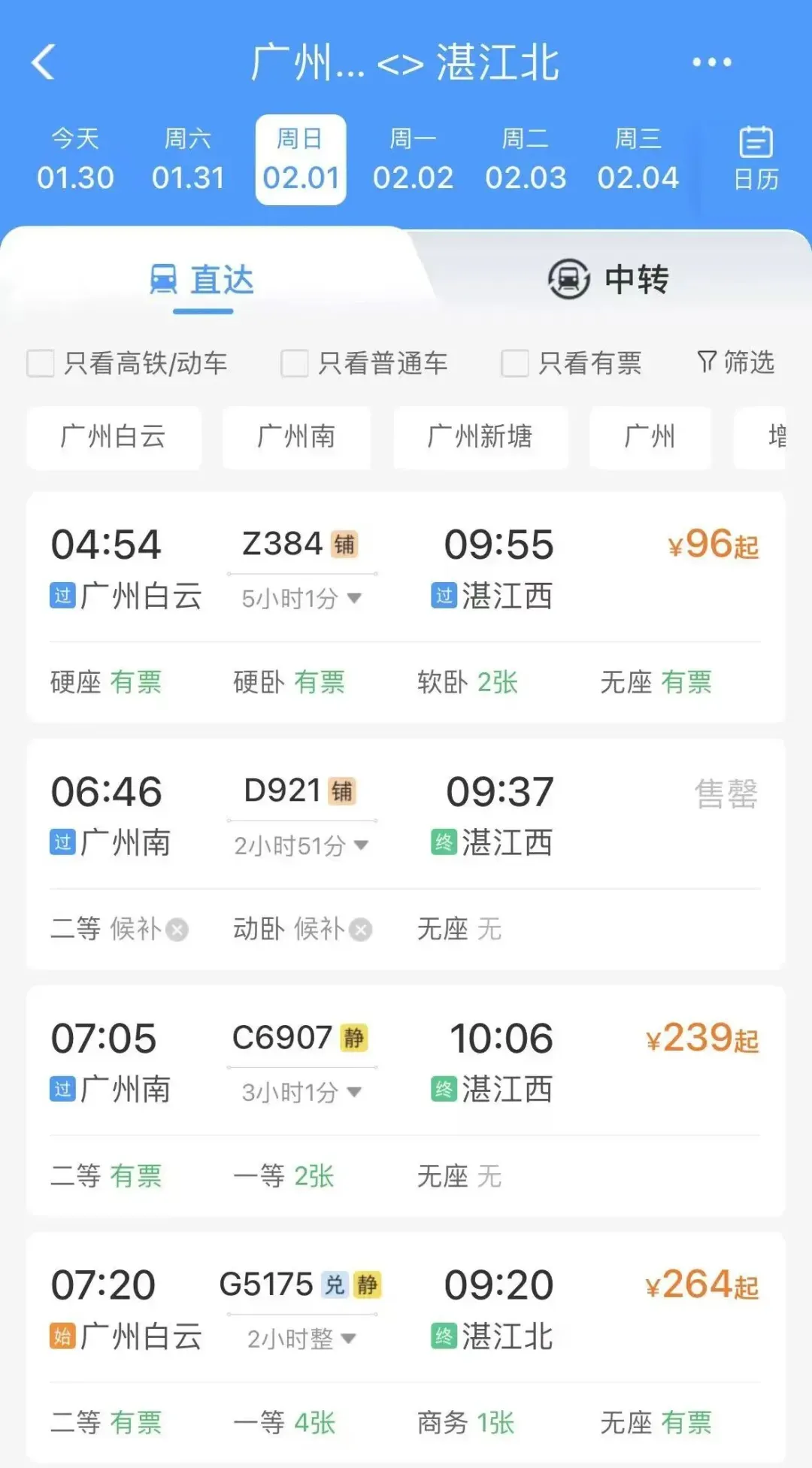 自1月30日起,广州火车站正式接入广湛高铁,旅客可以从广州站乘车经新开通的广湛高铁前往湛江北站,车票已经开售。查询12306页面可发现,2月2日前,广州—湛江线路均为经停广州站,并非广州站始发,1月30日只有5趟列车,首趟车12:50从广州站开出,中途经停茂名南站,14:32抵达湛江北站,耗时1小时42分钟。随后两天,列车分别增至9趟和11趟。从2月2日春运开始,广州站将首次开行广湛高铁始发列车,当天一共开行33列广湛高铁列车,其中20列为广州站始发,全程最快1小时30分钟,即可从广州市中心抵达湛江市中心城区。与此同时,广州白云站依然执行首发及经停任务,乘客仍能选择从广州白云站到达湛江的路线。同时,广湛高铁连通广汕、汕汕高铁,一路通行至汕头站,湛江北站至汕头站全程最快运行时间压缩至4小时27分。依托广湛高铁与广汕高铁的线路衔接,构建起湛江北站直达汕头站的快速通道,惠及茂名、阳江、阳春、新兴、汕尾、潮南等沿线城市和县域居民,较以往绕行线路大幅压缩运行时间,粤港澳大湾区与粤东、粤西地区的“双向奔赴”更加便捷高效。
