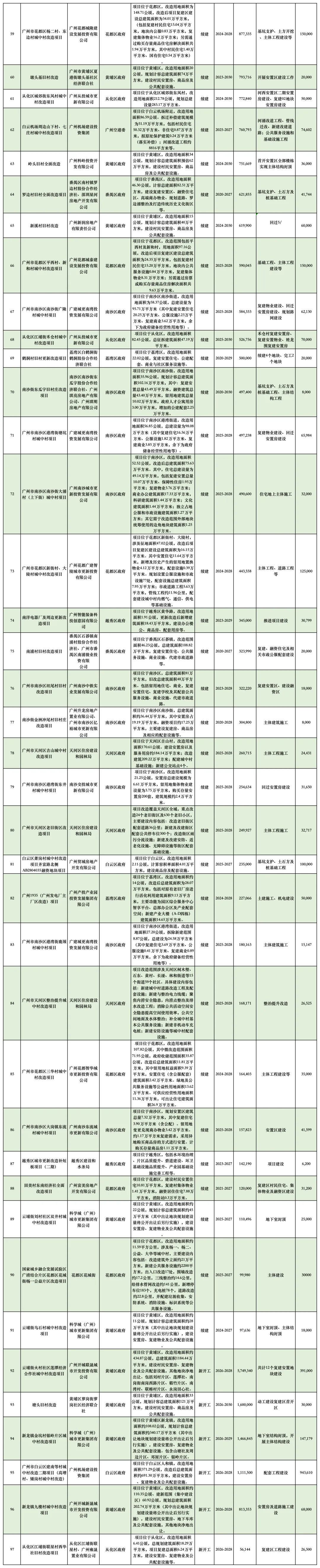 白云区与番禺区的改造计划同样规模庞大,侧重于与重大基础设施和产业园区联动。白云区共有螺涌松南松北村、陈田村、夏茅村等13个项目在列,其中大沥田心营溪柏塘村、三元里村等项目年度计划投资均超1.5亿元。与机场噪音治理、轨道交通装备产业园发展相关的项目也在加快推进。番禺区里仁洞村改造继续推进旧村拆除复建,总投资350亿元;南浦村、罗边村等项目也处于建设期。这些项目将有效改善城市北部和南部的人口密集区人居环境,并支撑白云机场、广州南站、广州国际创新城等枢纽和平台的建设。