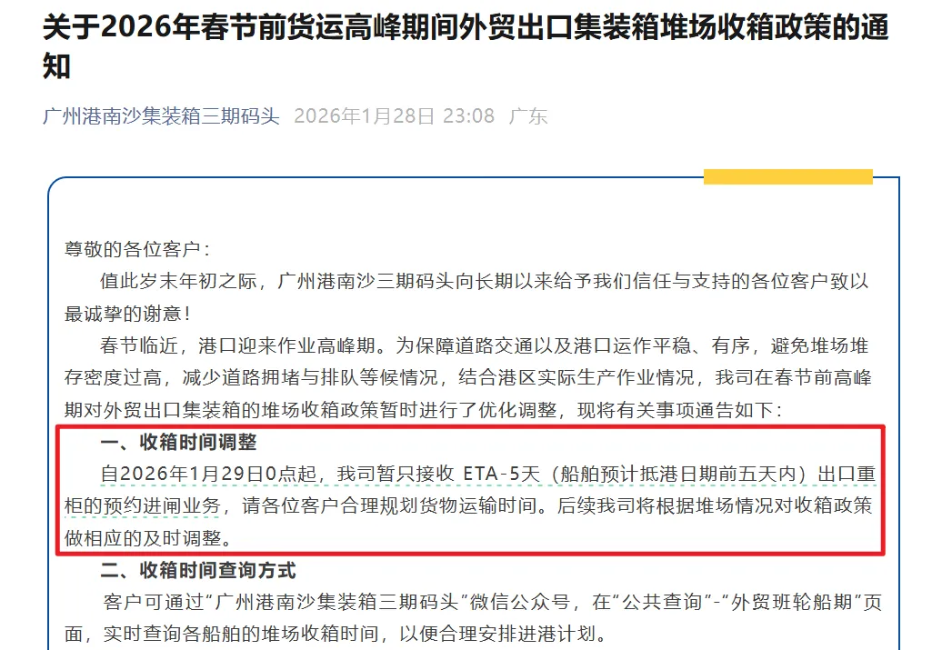 为保障道路交通以及港口运作平稳、有序,避免堆场堆存密度过高,减少道路拥堵与排队等候情况,自1月29日0点起,南沙二期、三期码头暂只接收ETA-5天(船舶预计抵港日期前五天内)出口重柜的预约进闸业务。