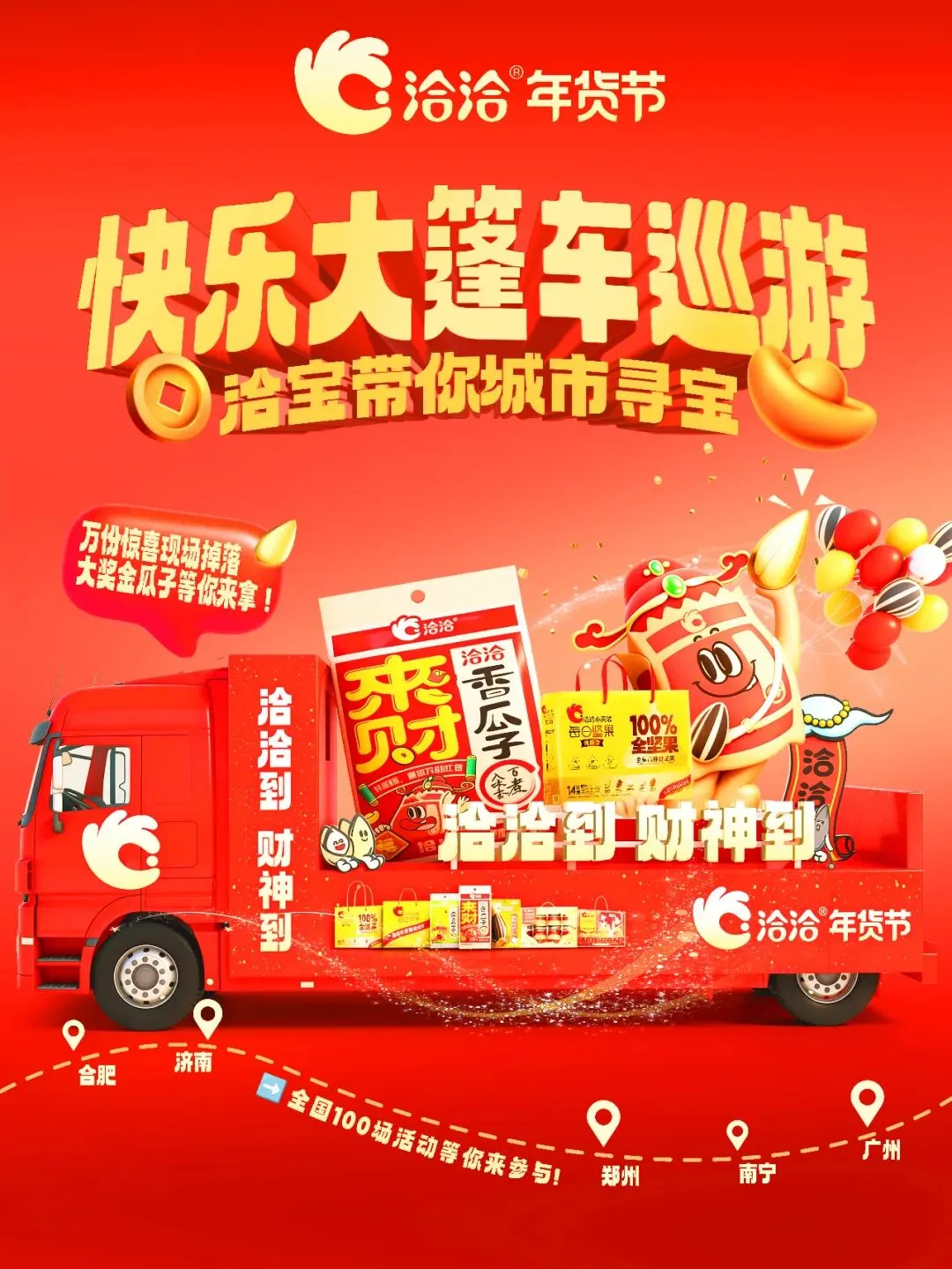 2月1日,前往洽洽快乐大篷车停驻地广州嘉禾金铂天地,根据现场线索寻找隐藏的“财神宝物卡”,凭卡即可领取对应奖品,宝贝“金瓜子”、洽宝周边先到先得!