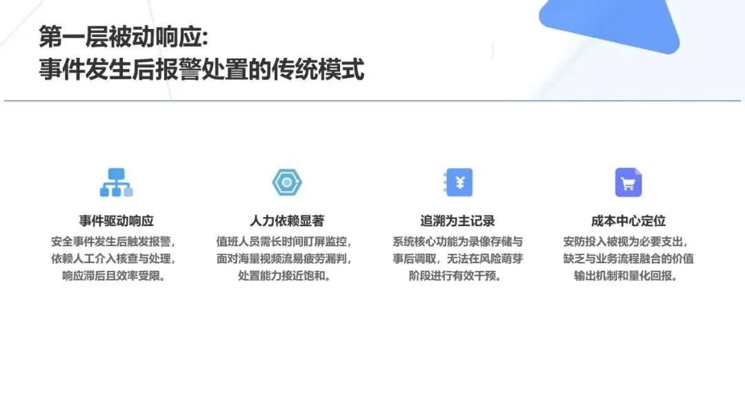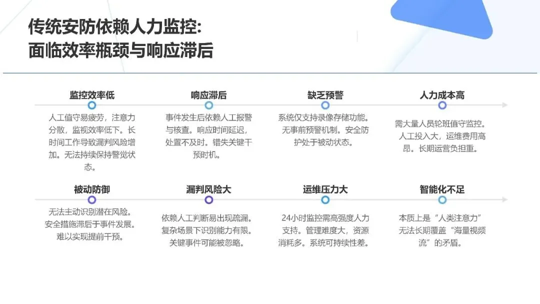 智慧安防的第一个阶段是依赖人力监控,人力监控的好处非常明显,就是很灵活,但劣势也同样突出,它存在监控效率的瓶颈和响应的滞后,还缺乏预警。我们整体的安防是处在被动状态的,没办法识别潜在风险,安全措施往往落后于事件发展,难以实现提前干预。