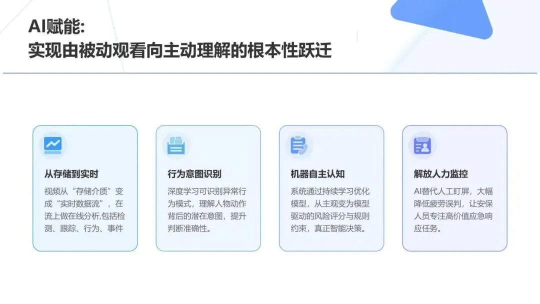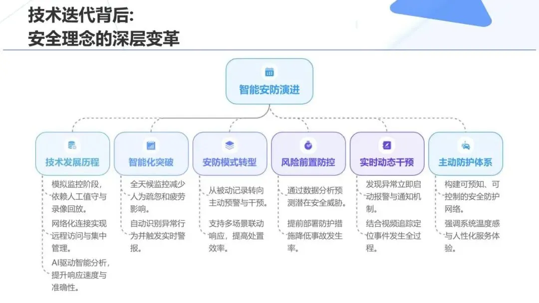 技术迭代的背后,看似是行为模式的转变,实则是更深层次的安全理念的变革。学术上,我们一般把智慧安防的发展阶段分为三步:第一步是模拟监控阶段,这一步依赖人工值守与录像回放;第二步是网络化连接,把信息集合到中枢,实现远程访问与集中管理;第三就是在AI时代,驱动智能分析,从而提升响应速度和准确性。