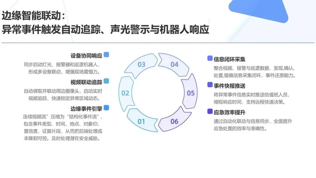 在这背后,我们把整体的响应叫做边缘事件引擎。它通过把连续视频流压缩为结构化的事件流,把事件变成结构化信息,包含事件类型、时间、定向对象ID、置信度、证据片段,从而把后端处理成本降低到可控范围之内,及时处理潜在安全威胁。