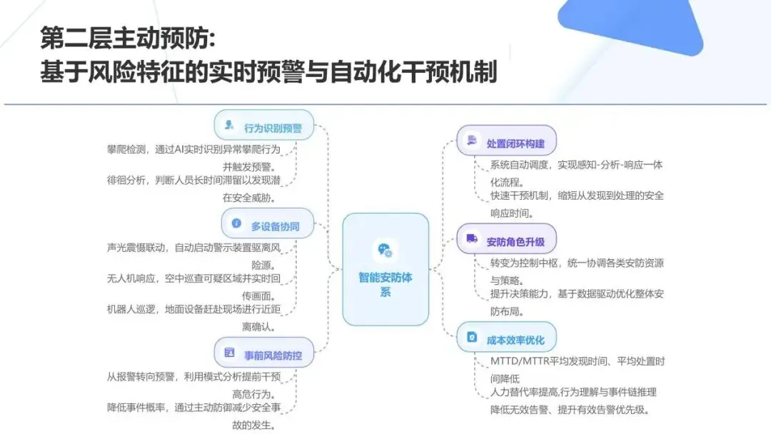 到了今天,智慧安防可以提供更多价值,这是第二层价值。它可以带来基于风险特征的实时预警与自动化干预,这就是我们前面提到的智慧安防特色所带来的成本效率转化,能够显著降低 MTTD、MTTR 这些平均发现时间、平均处置时间的指标,提升人力替代率。