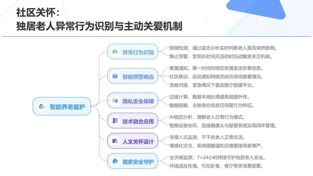 第四个场景,是在适老化这个社会整体背景下提出来的,就是独居老人的异常行为识别和主动关爱机制。在这个场景之下,我们通过异常行为识别和智能预警响应,同时注重隐私安全保障和人文关怀设计,实现居家安全防护。