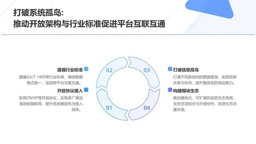 同时,目前新生产的设备可以采用ONVIF 等开放协议,实现多厂商设备的即插即用,打破信息孤岛,构建模块化的信息生态。